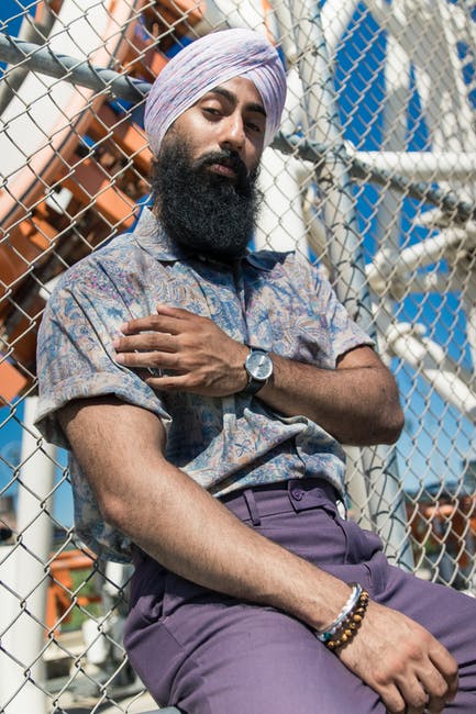 男人穿着紫色的头巾和灰色的polo衫,紫色的裤子躺在灰色的旋风栅栏上 · 免费素材图片