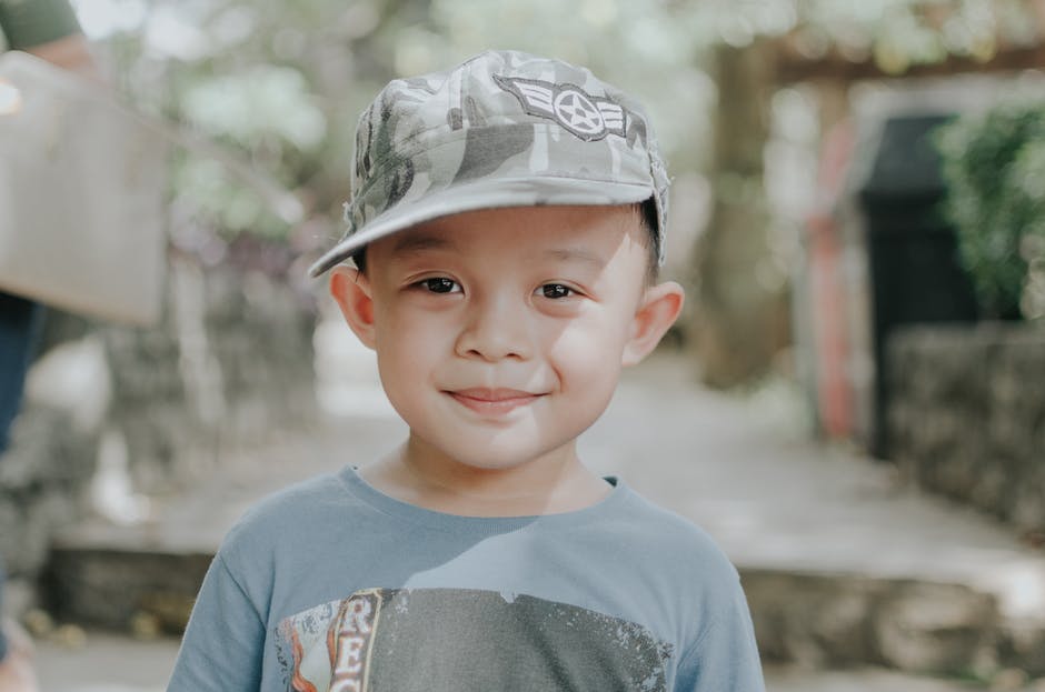 迷彩帽的微笑男孩的选择性焦点肖像照片 · 免费素材图片