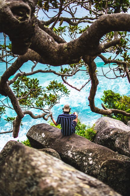 一名男子独自坐在树枝附近岩石上的高角度拍摄 · 免费素材图片