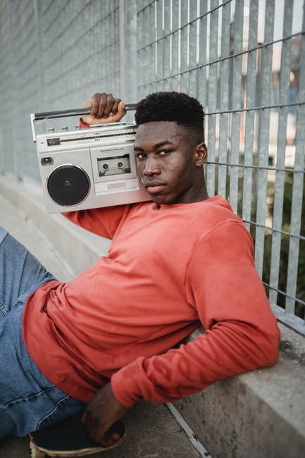 在户外的老式盒式录音机上听音乐的黑人滑板手 · 免费素材图片