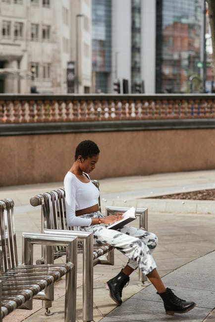 在都市长凳上的黑人妇女读书课本 · 免费素材图片