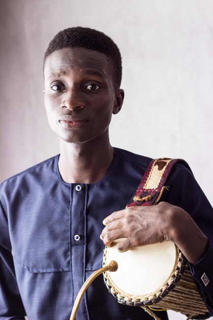 穿着蓝色圆领长袖衬衫站立时按住棕色音乐鼓的人 · 免费素材图片