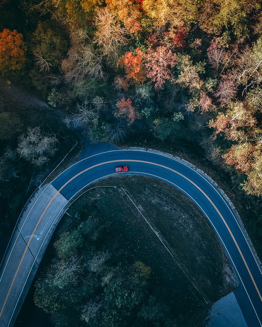 树木之间的道路上行驶的汽车的航拍 · 免费素材图片