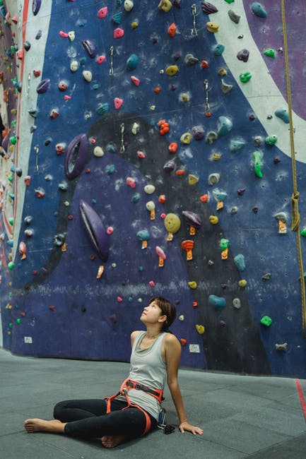 梦幻亚洲登山者在攀岩墙附近的地板上休息 · 免费素材图片