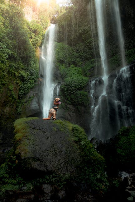 站在瀑布附近的岩石上的人穿着恐龙服装 · 免费素材图片