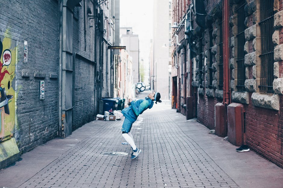 在巷子里踢足球的蓝夹克和蓝色牛仔牛仔裤的男人 · 免费素材图片
