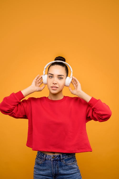 红色庄稼上面佩带的白色耳机的女孩 · 免费素材图片