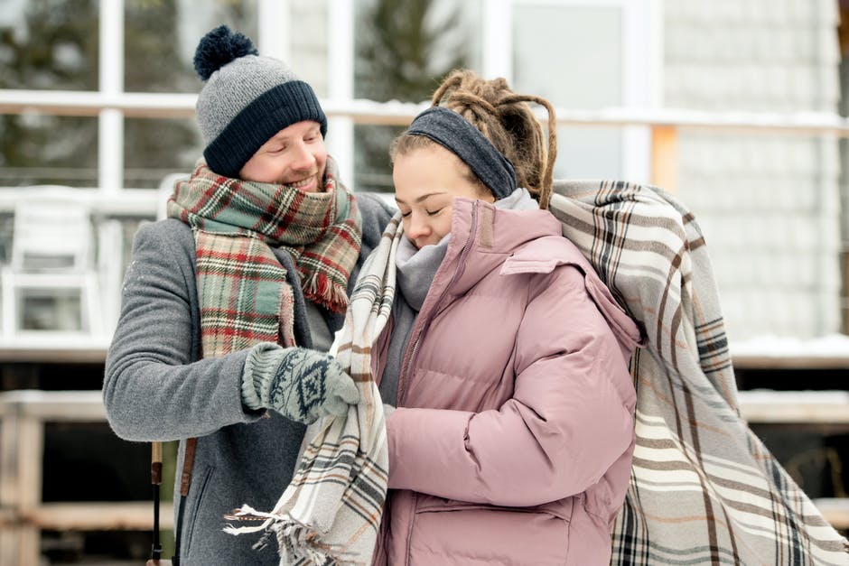 男人把围巾放在女人的肩膀上 · 免费素材图片