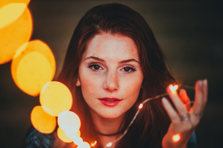 女人抱着黄色的字符串灯的肖像照片 · 免费素材图片