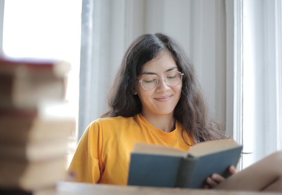 黄色的衬衫,读一本书时微笑的女人 · 免费素材图片