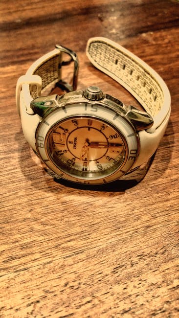 圆形银色和白色模拟手表,棕色木质表面上带有白色橡皮筋 · 免费素材图片
