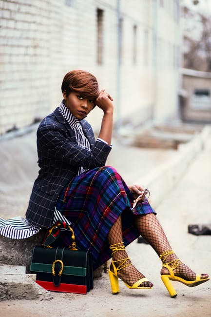 女人穿着黑色和灰色tattersall西装外套和多彩多姿的格子裙,配黑色网眼长袜和黄色矮胖的凉鞋,坐在灰色的混凝土路 · 免费素材图片