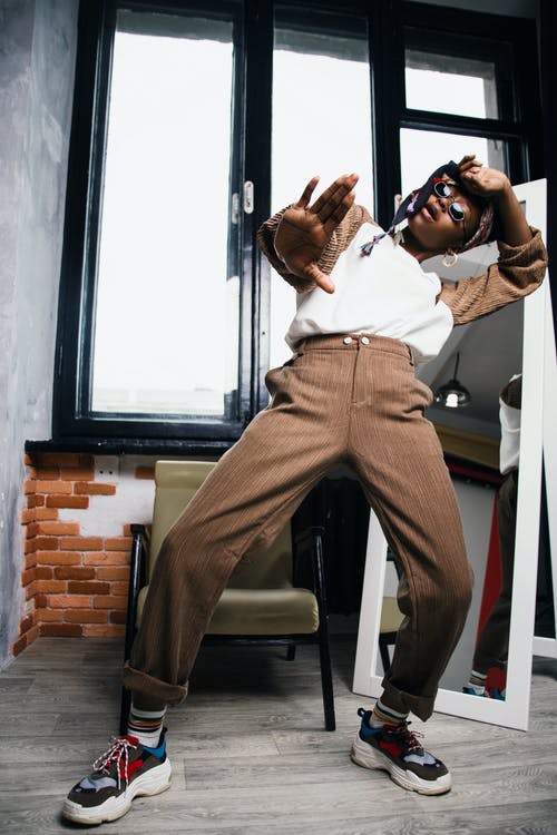 女人穿着白衬衫和棕色外套与太阳镜和花卉头巾以自拍照与镜子在她旁边 · 免费素材图片