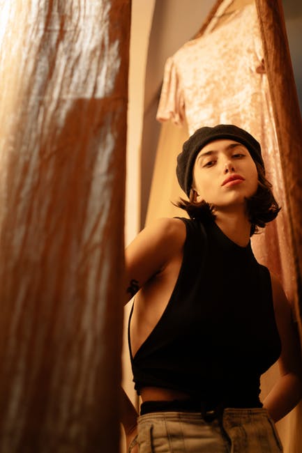 黑色背心站在棕色的窗帘旁边的女人 · 免费素材图片