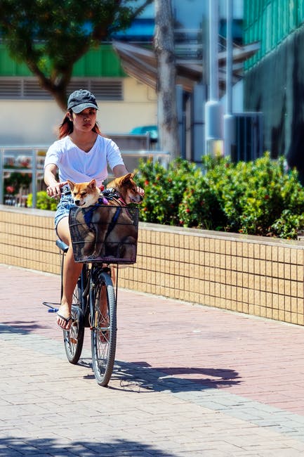 女人与狗在篮子里骑自行车 · 免费素材图片