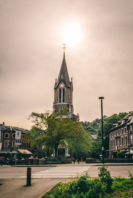 棕色和绿色的教堂,在白色的天空下树附近 · 免费素材图片
