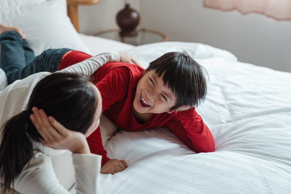 母亲和儿子躺在床上的照片 · 免费素材图片
