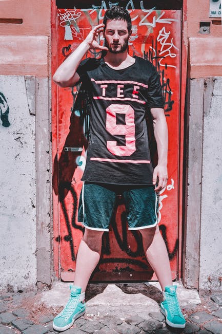 身穿黑色t恤,站在红色金属门附近的人 · 免费素材图片