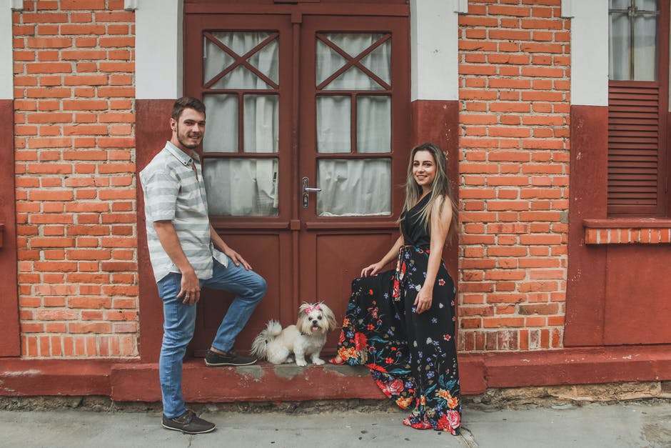 微笑的男人和女人之间的白狗 · 免费素材图片