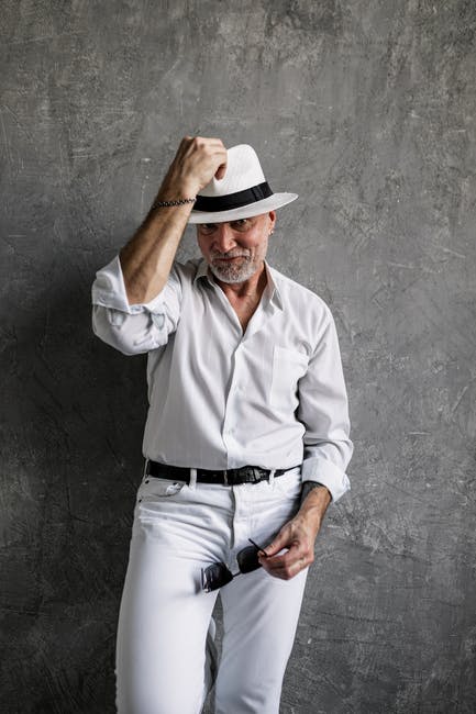 白色的衬衫和白色的裤子,穿着棕色软呢帽的男人,靠在灰色的墙上 · 免费素材图片