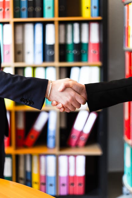 在架子上的书前两人握手 · 免费素材图片