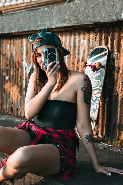 女人穿着黑色无肩带上衣,拿着灰色的傻瓜相机 · 免费素材图片