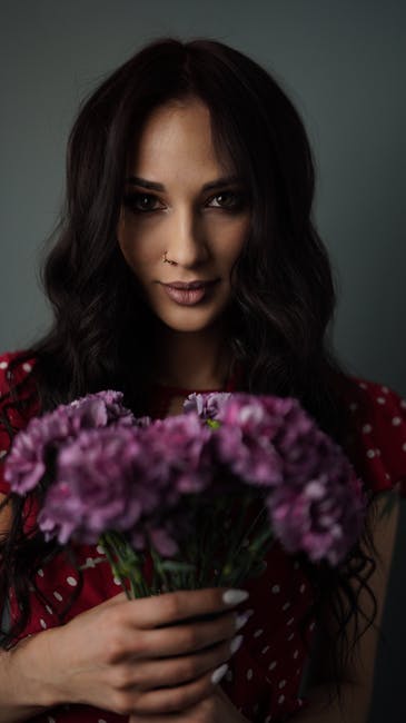 有关一束鲜花, 圆点连衣裙, 垂直拍摄的免费素材图片
