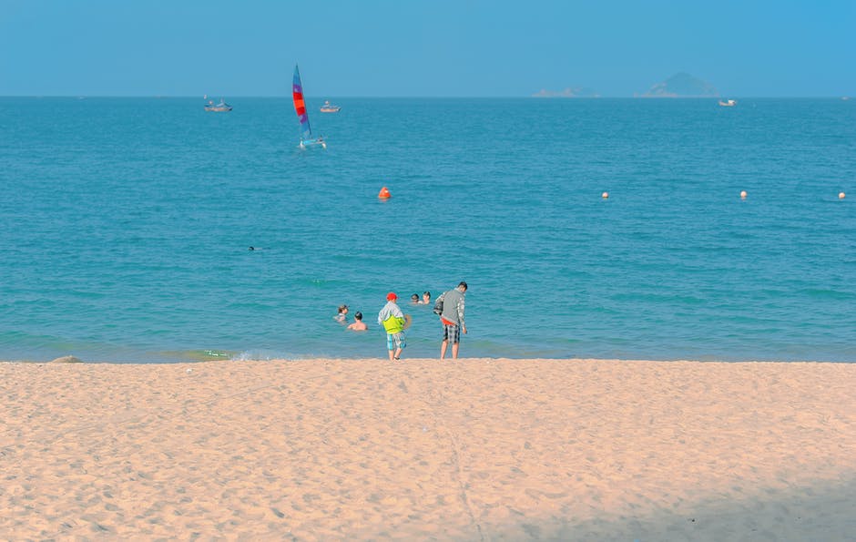 两个孩子站在海边,在蓝蓝的天空下 · 免费素材图片