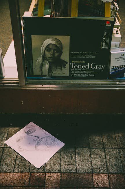 在艺术商店橱窗附近的人行道上的铅笔素描 · 免费素材图片