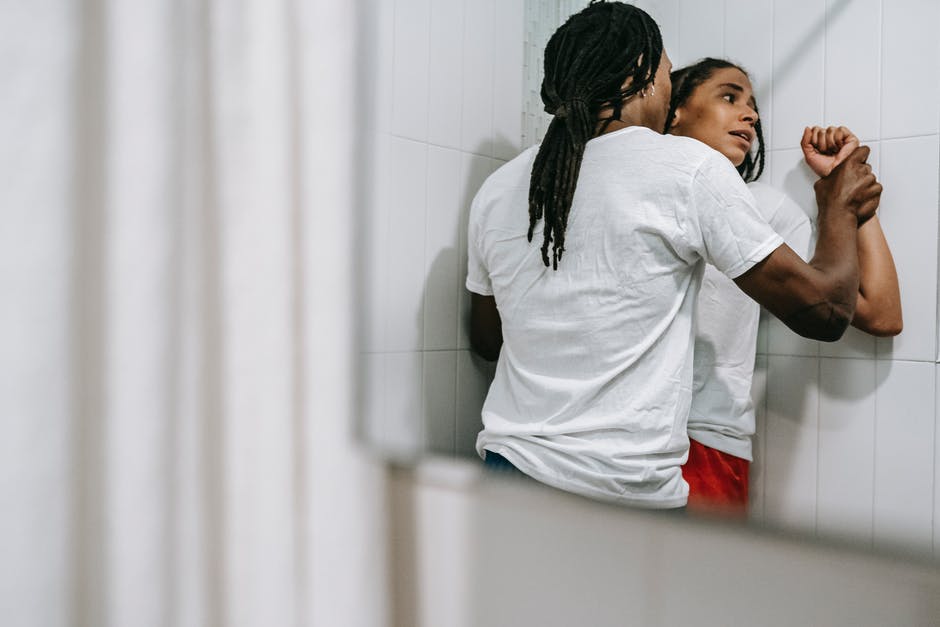 匿名黑人在浴室争吵期间将害怕的妻子推到墙上 · 免费素材图片