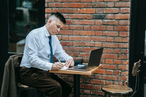使用黑色便携式计算机的白色长袖衬衫的人 · 免费素材图片