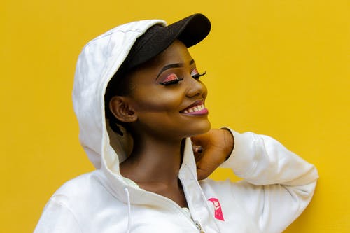 一个女人闭着眼睛摆在一件白色的帽衫毛衣 · 免费素材图片