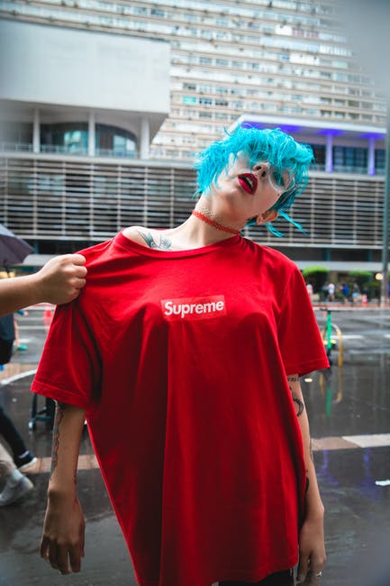 蓝绿色头发的女人,穿着红色至尊衬衫按人 · 免费素材图片