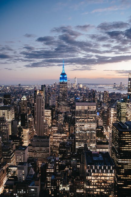 多云的夕阳的天空下曼哈顿的照明的摩天大楼 · 免费素材图片