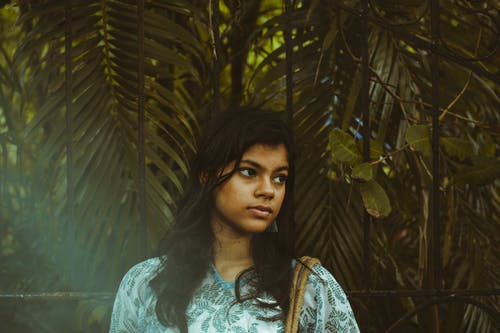 女人看着绿叶植物背后的特写肖像照片 · 免费素材图片