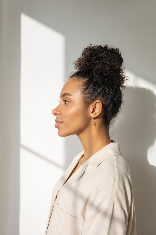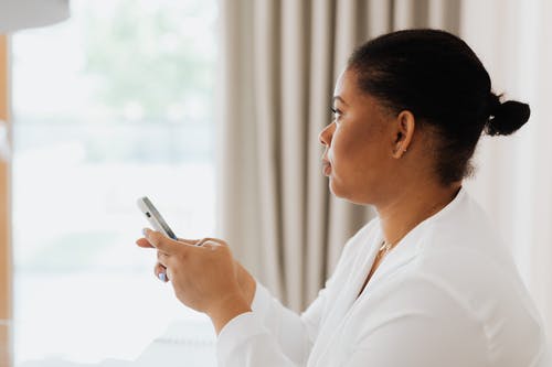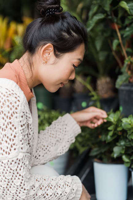 看着绿叶的白色开衫的女人 · 免费素材图片