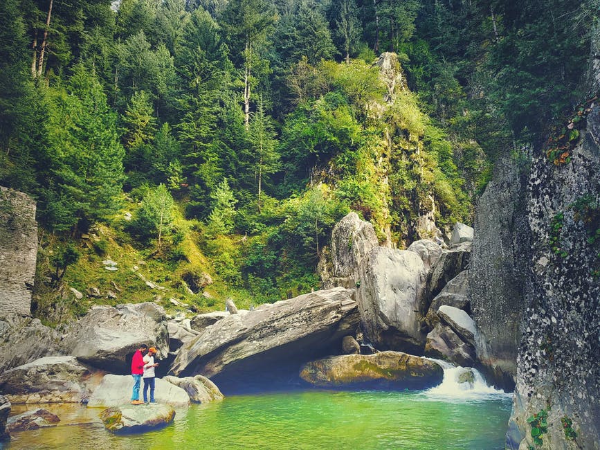 男子站在绿河旁边的岩石上 · 免费素材图片