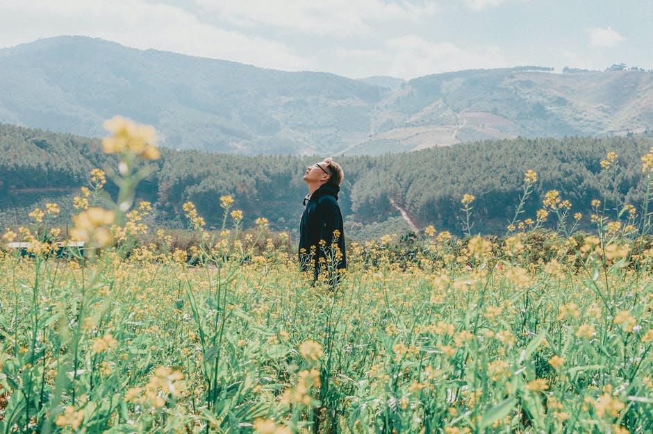 站在山上的黄色油菜花田里的男人 · 免费素材图片