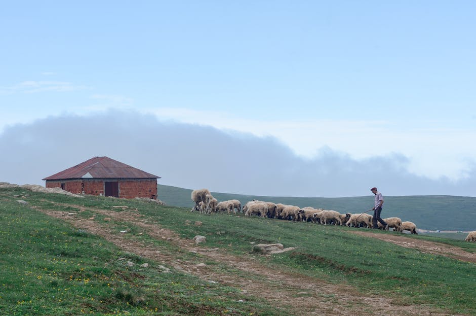 牧羊人在砖房旁边的草地上walking羊的羊的照片 · 免费素材图片
