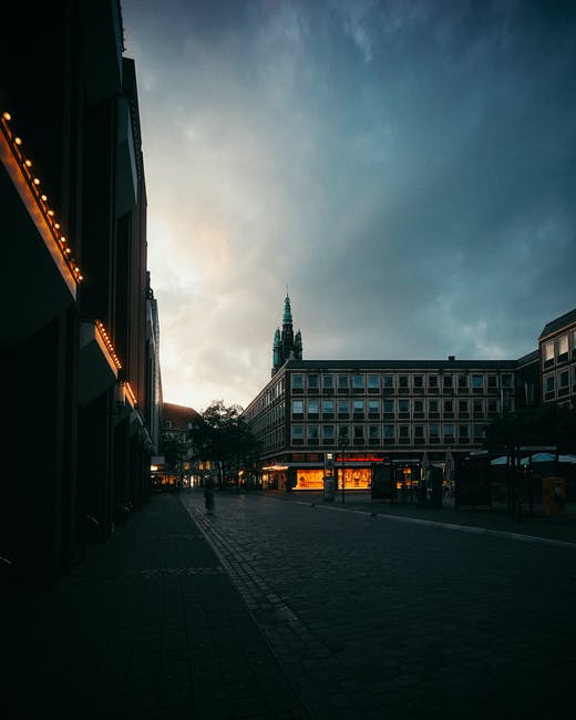 低空拍摄的城市建筑,在黄昏的多云的天空下空荡荡的街道上 · 免费素材图片