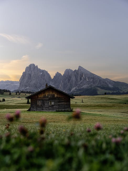 日落时天空下坐骑背后的草地上的寂寞建筑 · 免费素材图片