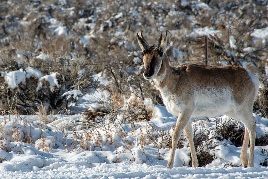棕色和白色的鹿在雪中行走的照片 · 免费素材图片