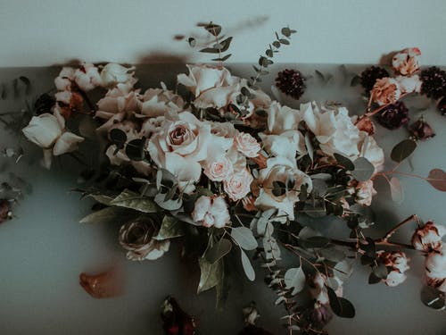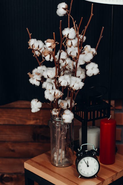 时钟旁边的花瓶里的白色棉花花 · 免费素材图片