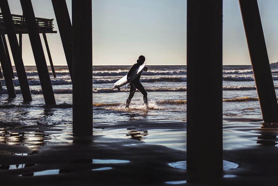 冲浪者走在海滩码头附近 · 免费素材图片