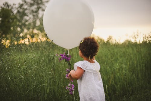 坐在气球旁草地上的女孩