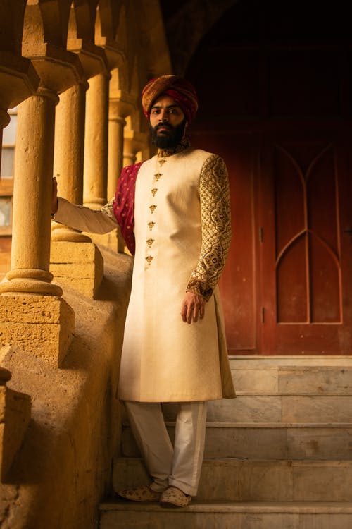身穿白色和棕色传统服装的男子站在黑色墙壁旁边