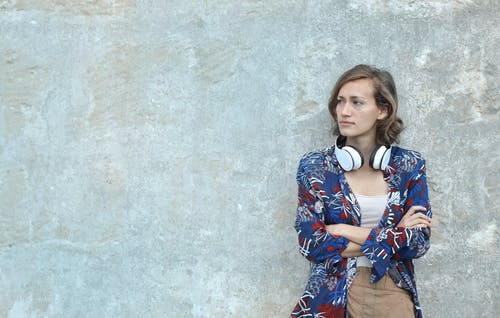 面带微笑的男子身穿蓝色牛仔衬衫,倚在灰色的水泥墙上