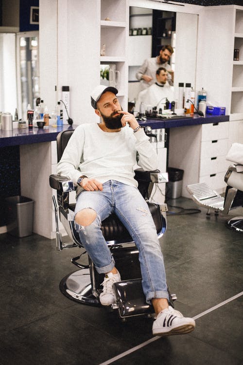 穿着黑白校服坐在黑色柳条椅上的妇女