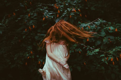 白天站在森林里的穿粉红色衣服的女孩