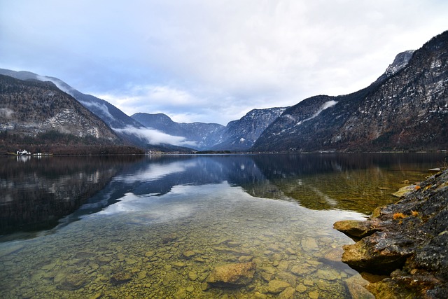 靠近水体和山体的棕色和白色混凝土房屋